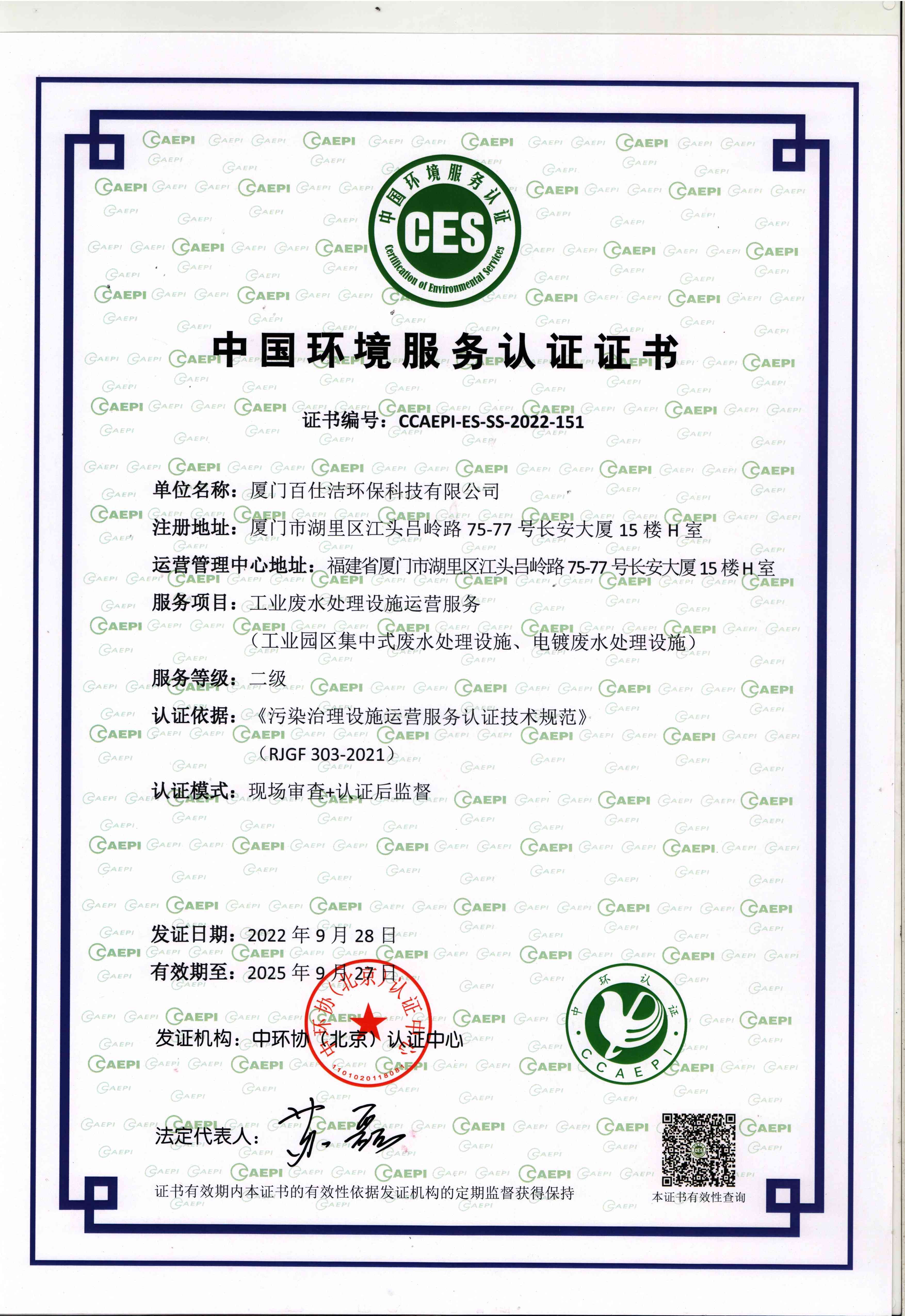 中國環(huán)境服務(wù)認證證書